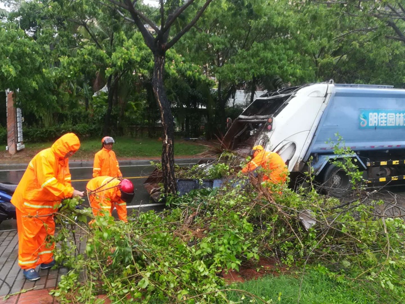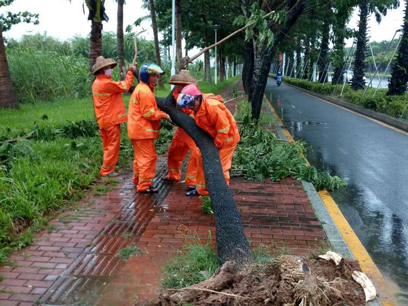 今年第9號臺風(fēng)“山神”的中心于今天凌晨4點(diǎn)50分前后,在海南萬寧市萬城鎮(zhèn)沿海登陸。受其影響,今天三亞、陵水有大到暴雨,將三亞、陵水街頭不少樹木刮倒,到處是殘枝敗葉,一片狼藉。臺風(fēng)中,為了確保市容環(huán)境的整潔、干凈,集團(tuán)公司安排環(huán)衛(wèi)工人全員上崗,加緊清理街道路面,使城市迅速恢復(fù)潔凈。