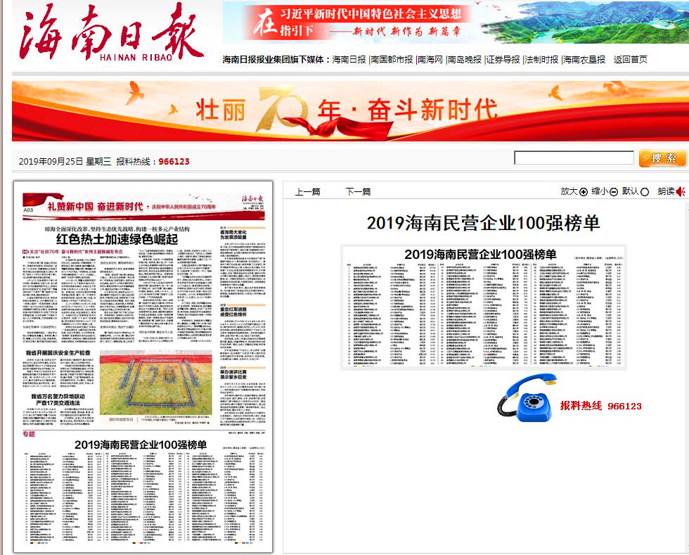 明佳集團(tuán)被評為“2019海南民營企業(yè)100強(qiáng)”企業(yè)