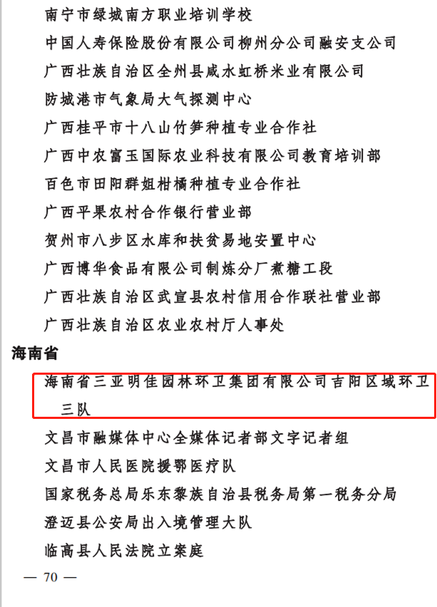“芬芳三月,如歌巾幗?!痹趹c祝第111個(gè)三八國(guó)際勞動(dòng)?jì)D女節(jié)之際,三亞明佳園林環(huán)衛(wèi)集團(tuán)有限公司吉陽(yáng)區(qū)域環(huán)衛(wèi)三隊(duì)榮獲2020年度“全國(guó)巾幗文明崗”榮譽(yù)稱號(hào)?!叭珖?guó)巾幗文明崗”是全國(guó)婦女“巾幗建功”活動(dòng)專設(shè)崗, 是全國(guó)婦聯(lián)為表彰積極為國(guó)家、為社會(huì)、為人民做出突出貢獻(xiàn),取得優(yōu)異的優(yōu)秀婦女團(tuán)體而頒發(fā)的榮譽(yù)稱號(hào)。