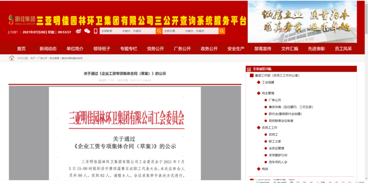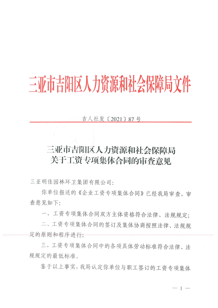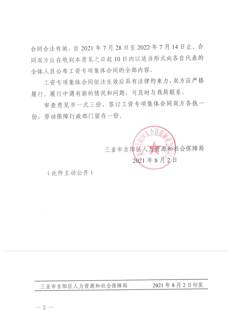 2021年8月2日,吉陽區(qū)人社局審查通過我公司《企業(yè)工資專項集體合同》。8月4日報三亞市總工會基層工作部備案。至此,三亞明佳園林環(huán)衛(wèi)集團有限公司2021年度企業(yè)工資集體協(xié)商工作圓滿結(jié)束。