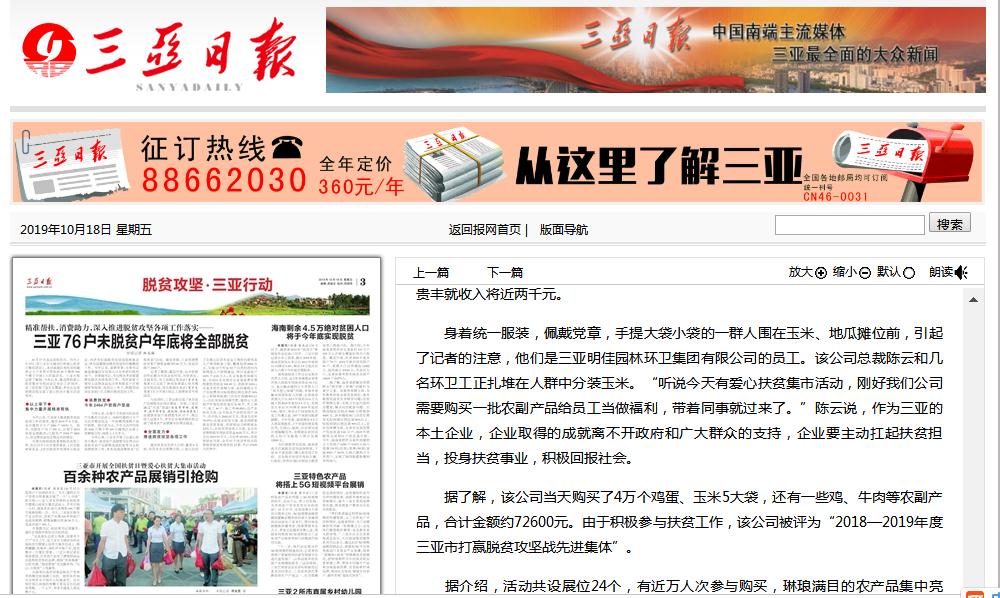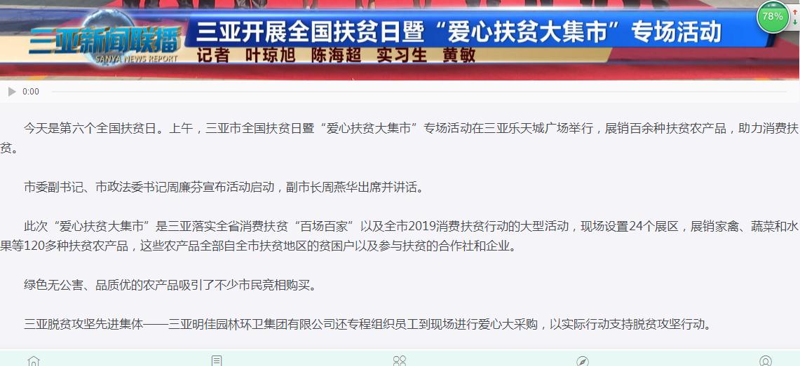 明佳集團(tuán)作為三亞的本土企業(yè),主動(dòng)扛起扶貧擔(dān)當(dāng),投身扶貧事業(yè),積極回報(bào)社會(huì)。在此次大采購活動(dòng)中,集團(tuán)員工在總裁陳云的帶領(lǐng)下,購買了4萬個(gè)雞蛋、玉米5大袋,還有一些雞、牛肉等農(nóng)副產(chǎn)品,合計(jì)金額約72600元。三亞日報(bào)和三亞新聞聯(lián)播分別對明佳集團(tuán)的愛心大采購活動(dòng)進(jìn)行了報(bào)道。
